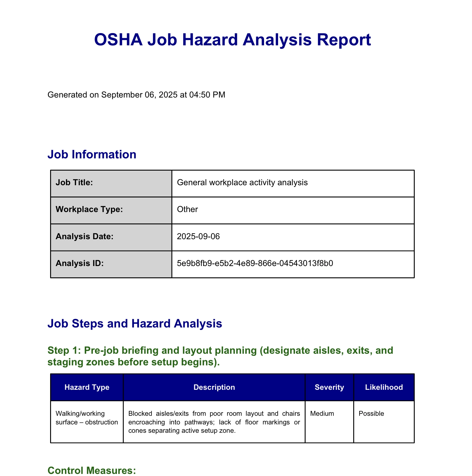 Each site scan generates a full OSHA Job Hazard Analysis. The report provides an analysis summary, step-by-step job breakdowns, detailed hazard assessments, OSHA-based control measures, overall risk ratings, safety recommendations, and emergency procedures.